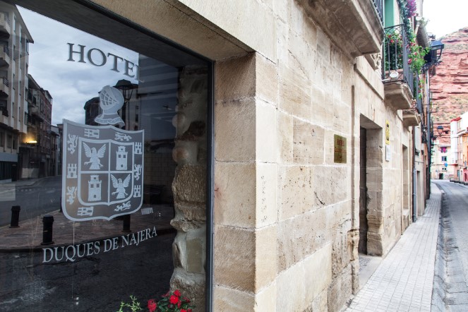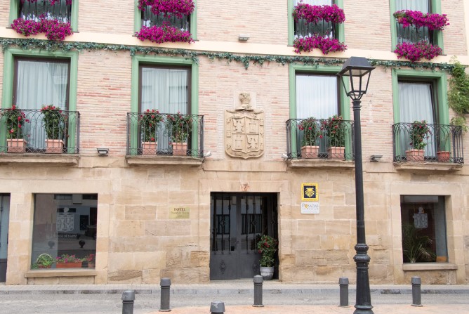 La fachada del Hotel Duques de Nájera conserva la esencia de una casona señorial riojana, con balcones adornados de flores, detalles en piedra y un escudo que honra su historia. Ubicado en pleno centro, es el punto de partida perfecto para explorar la cultura, la gastronomía y los caminos de esta tierra llena de vida.