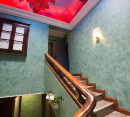 Sube por unas escaleras que combinan el estilo tradicional con un toque artístico. Los muros en tonos suaves y el techo decorado crean un ambiente acogedor y único, que te acompaña en cada paso hacia tu descanso. Ideal para quienes valoran los detalles también en los espacios comunes del hotel.